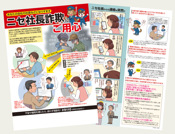 いわゆるビジネスメール詐欺が、「SNSに誘導する」手口を取り入れて巧妙化し、あらゆる業種・業態・規模の企業が標的にされています。 従業員に詐欺の指示が届くことから、企業に対してはもちろん、企業の従業員でもある地域住民のみなさんに対して、注意喚起する資料として、ご活用ください。