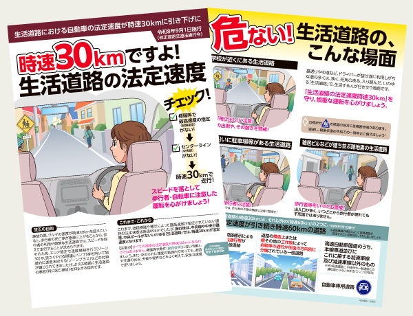 令和8年9月1日施行の法令改正により、「いわゆる生活道路の法定速度が時速30kmになる」ことを広く知らせ、事故防止につなげるための資料です。