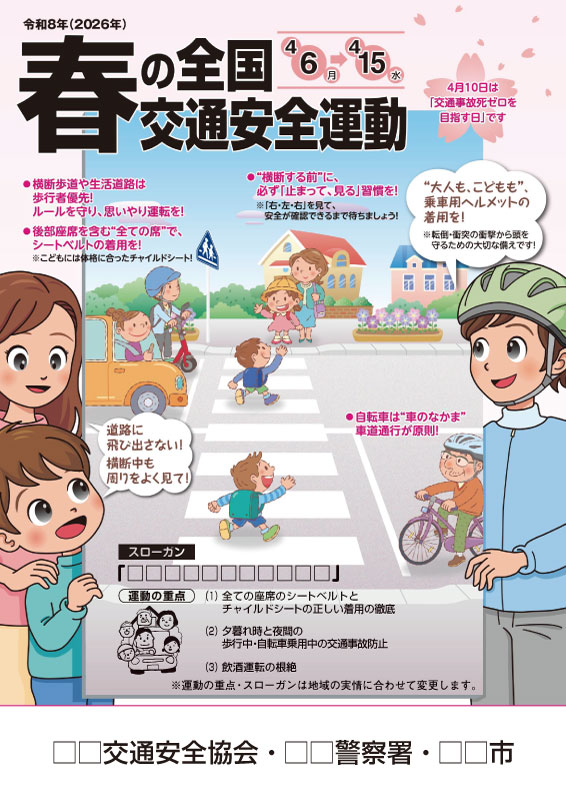 春の全国交通安全運動に則した内容をわかりやすく紙面に盛り込んでいます。全戸配布や回覧、街頭啓発など様々な用途に幅広くご活用ください。