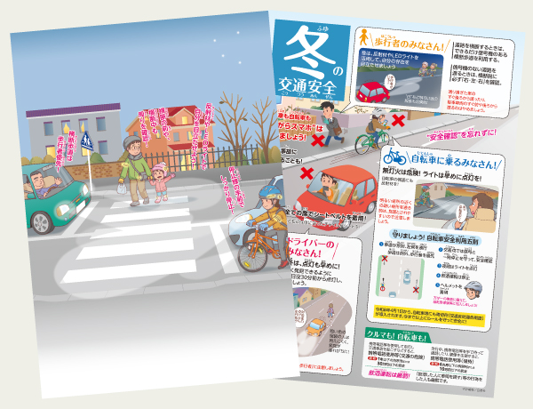 冬の交通安全運動に則した内容をわかりやすく紙面に盛り込んでいます。全戸配布や回覧、街頭啓発など様々な用途に幅広くご活用ください。