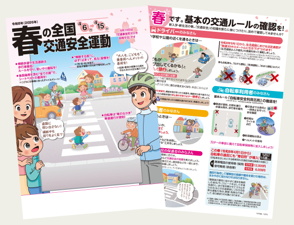 春の全国交通安全運動に則した内容をわかりやすく紙面に盛り込んでいます。全戸配布や回覧、街頭啓発など様々な用途に幅広くご活用ください。